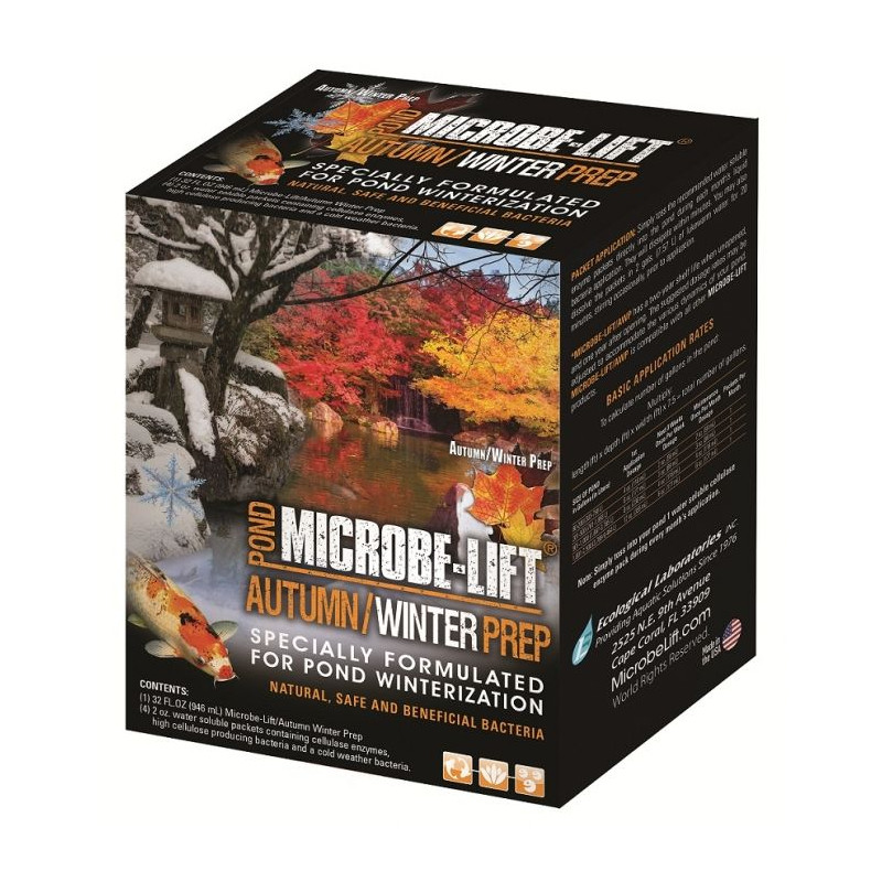 Speciální složení bakterií a enzymů urychluje biologický rozklad listí, odumřelých rostlin, odumřelých řas a dalších organických zbytků. Microbe-Lift Autumn Winter Prep pomáhá udržovat biologickou rovnováhu vody v jezírku, posiluje imunitním systém ryb a vodních živočichů během zimního období.