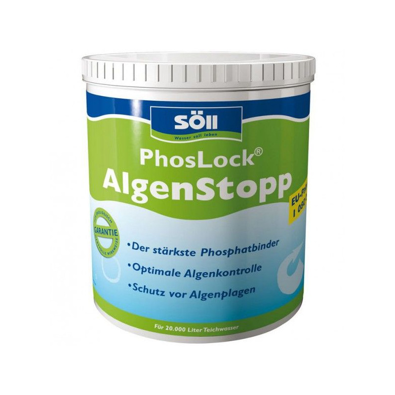 Přípravek proti řasám v jezírku PhosLock AlgenStopp 20 m3 odstraňuje z vody fosfáty, což jsou živiny pro řasy. Je také prevencí dlouhé řasy v jezírku. Přípravek proti řasám používáme pro ošetření vody před zimou a na jaře. Zamezuje růstu řas - optimální prevence proti růstu řas. Přípravek přemění fosfát na nerozpustný apatit. Laboratorní pokusy prokázaly, že obsah fosfátu je možno snížit na úroveň cca 0,0035 mg/l. Rovněž v jezírku je možné snížit obsah fosfátu pod úroveň, která je třeba k růstu řas.