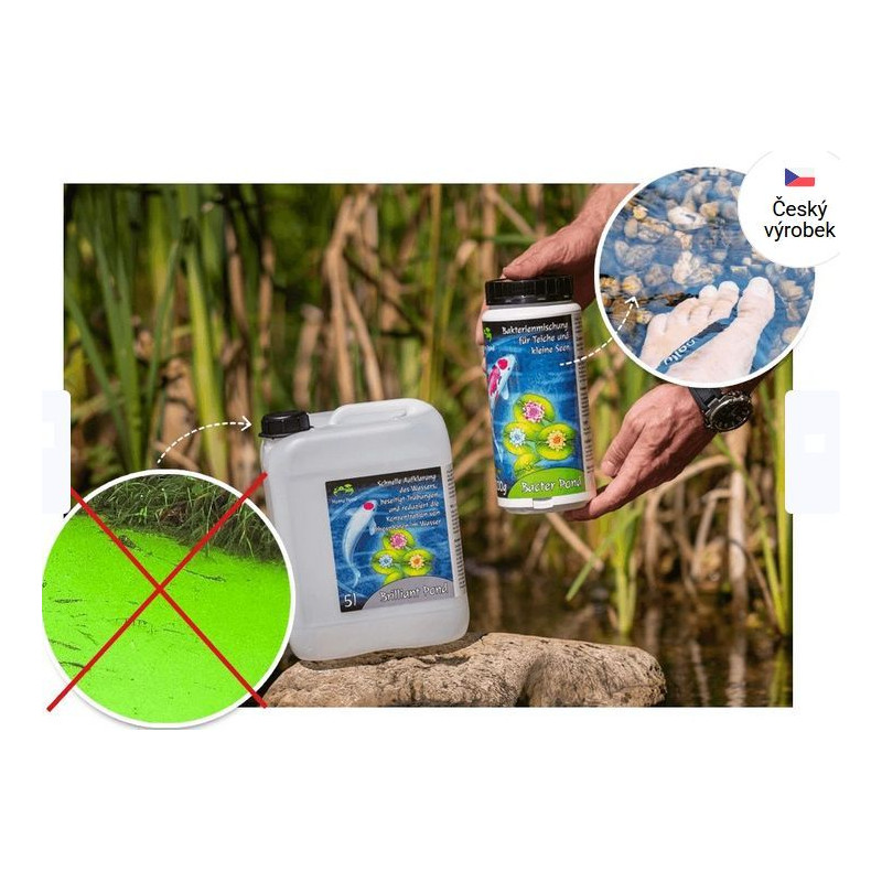 Přípravek Briliant Pond 3 l pro rychlé projasnění vody. BRIlLIANT POND odstraňuje zákal a snižuje obsah fosfátů ve vodě. Výsledkem je krásně čistá voda. Organické a minerální nečistotami jsou odstraněny. Po použití BRILLIANT POND do rybníčku vznikají bílé obláčky, které se navzájem shlukují, čímž na sebe vážou nečistoty. Shluky s nečistotami klesají ke dnu. Jedná-li se o zelený zákal, tak se mohou vytvářet shluky na hladině. BRILLIANT POND odstraňuje z jezírka fosfáty, které jako nerozpustné klesají v bílých shlucích rovněž ke dnu.