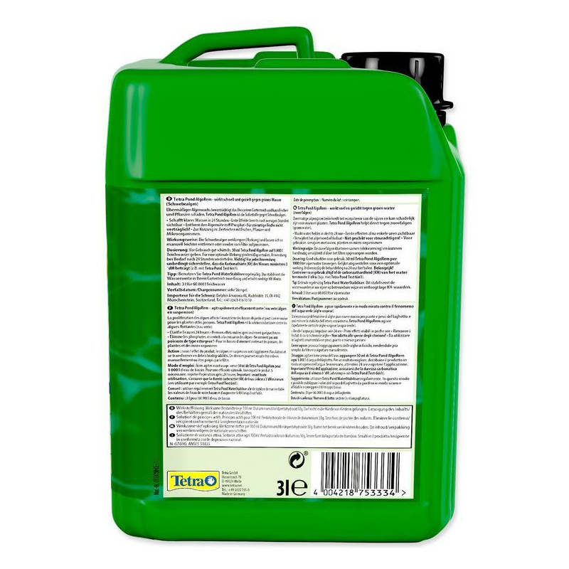 Tetra Pond Algorem je osvědčený přípravek proti plovoucím řasám (zelené vodě), který působí rychle a šetrně k životnímu prostředí. Neobsahuje herbicidy ani pesticidy a je vhodný pro většinu okrasných jezírek.