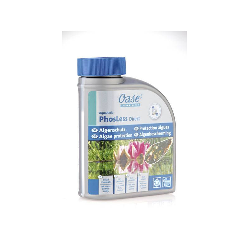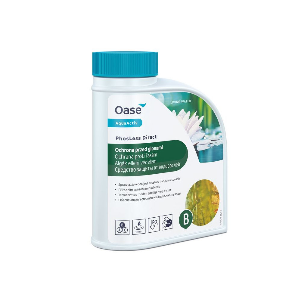 OASE Phosless Direct 500ml přeměňuje rozpustné fosfáty na nerozpustné minerály, které jsou pro řasy nedostupné. Tím zabrání jejich množení a zaručí vám křišťálově čistou vodu po celý rok.