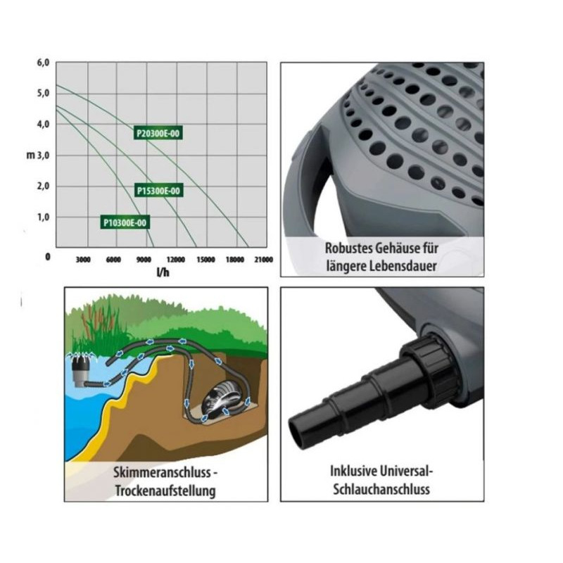 - Vysoká odolnost: Robustní tělo si poradí s nečistotami až do velikosti 10 mm. Proto je toto čerpadlo ideální pro jezírkové filtrace.