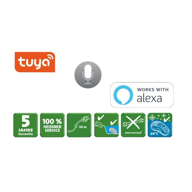 - Chytré ovládání: Připojení přes WiFi do aplikace Heissner Smart Garden (Android/iOS). Podpora hlasového ovládání.