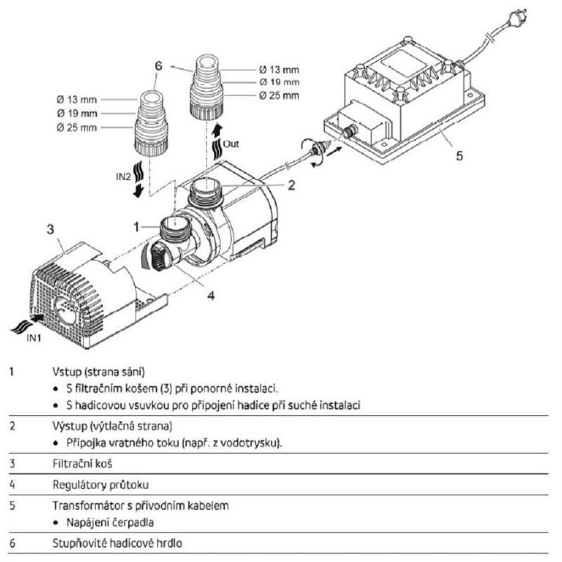 Obsah balení: Čerpadlo OASE Aquarius 1000, bezpečnostní transformátor, sada hadicových trnů.