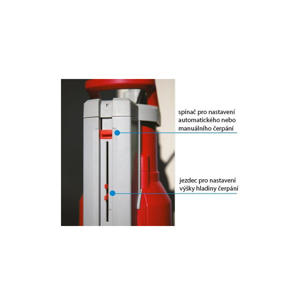 Čerpadlo MOBY 900 se spínačem pro automatické nebo manuální čerpání vody. Je také vybaveno jezdcem pro nastavení výšky hladiny čerpání.