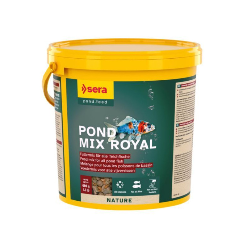 Sera směs vloček, granulí a celého gammarusu Pond Mix Royal 3800 ml je skvělým krmivem pro majitele jezírek, kteří chtějí zajistit zdravý a vyvážený jídelníček pro své ryby, a zároveň udržovat čistotu vody ve svém rybníčku. Balení 600g.