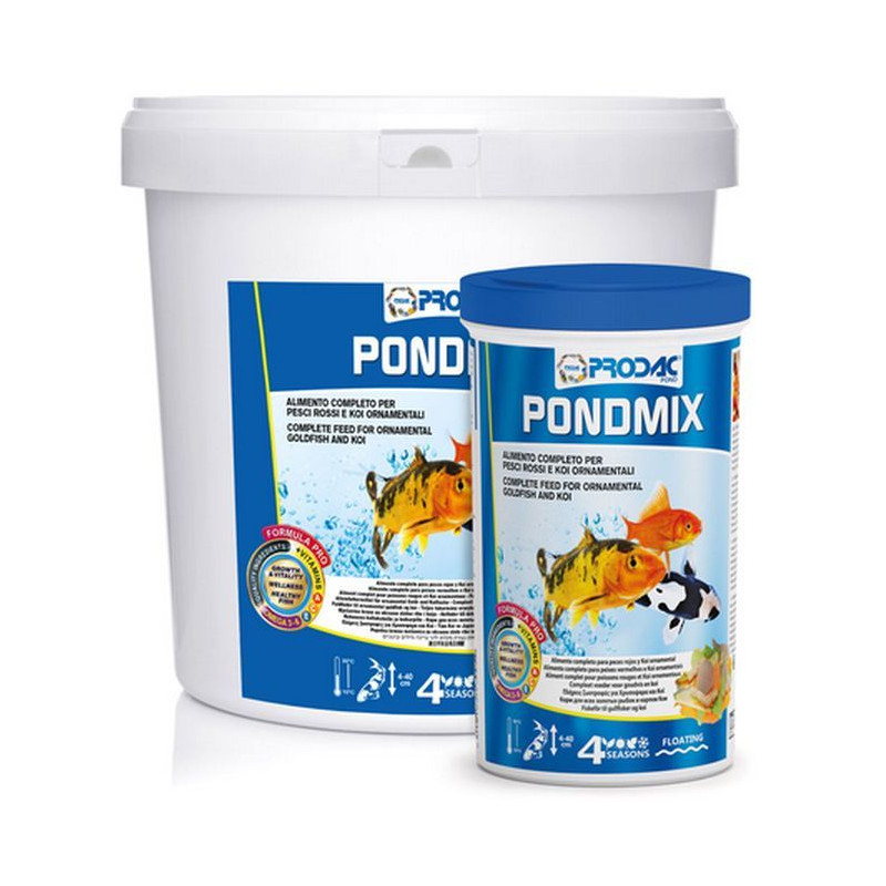 Prodac Pondmix 1 kg kbelík - krmivo pro ryby, KOI, karasy, jeseny a ostatní rybí osádku. Krmivo se jmenuje Mix protože se jedná o směs vloček a tyčinek, proto se s ním nakrmí malé rybky od 4 cm, po velké do 40 cm.