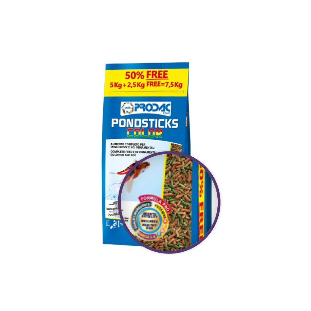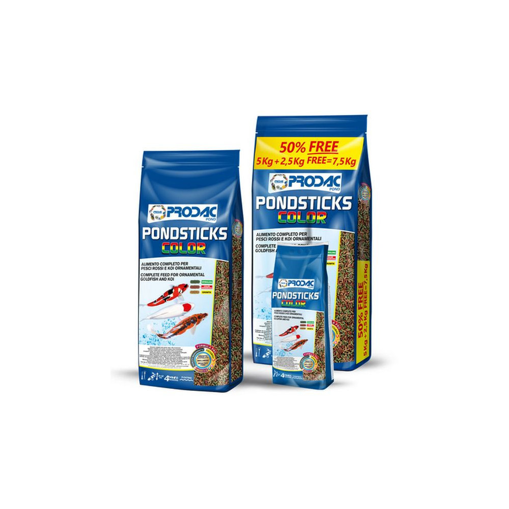 Prodac Pondsticks Color 5kg + 50% free je plovoucí krmivo pro jezírkové ryby. PondSticks Color 7,5 kg je mimořádně cenným krmivem pro všechny okrasné jezírkové ryby. Tyčinky plavou na vodě a nezakalují vodu.