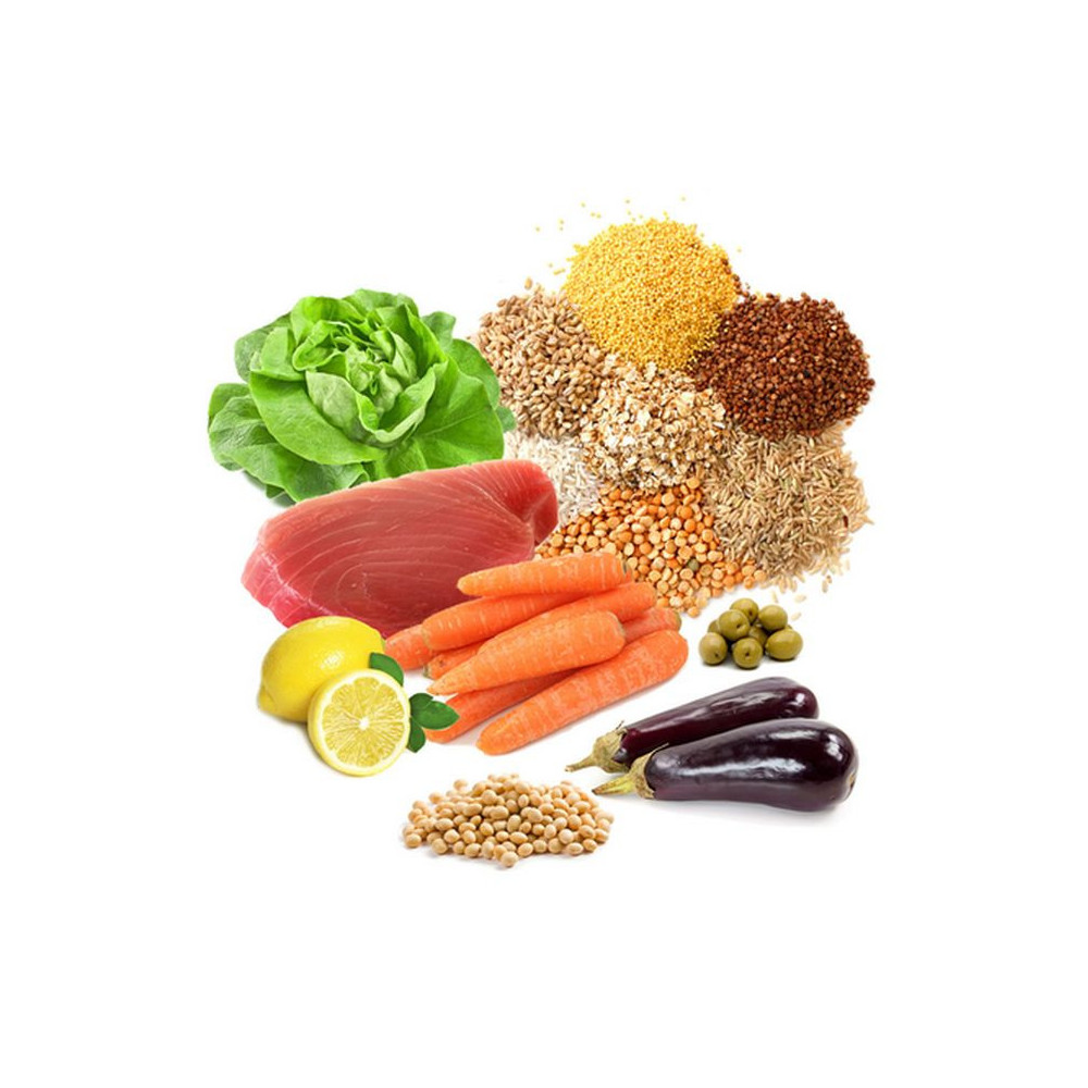 obiloviny, soja, ryby a produkty z ryb, korýši, zelenina a produkty ze zeleniny, řasy spirulina 0,20%.