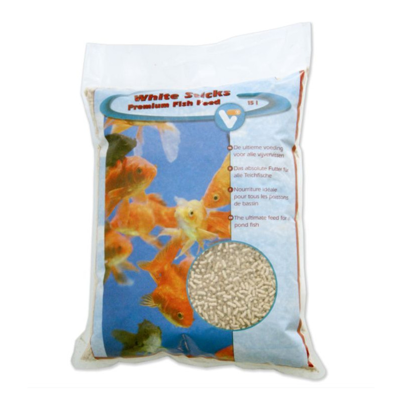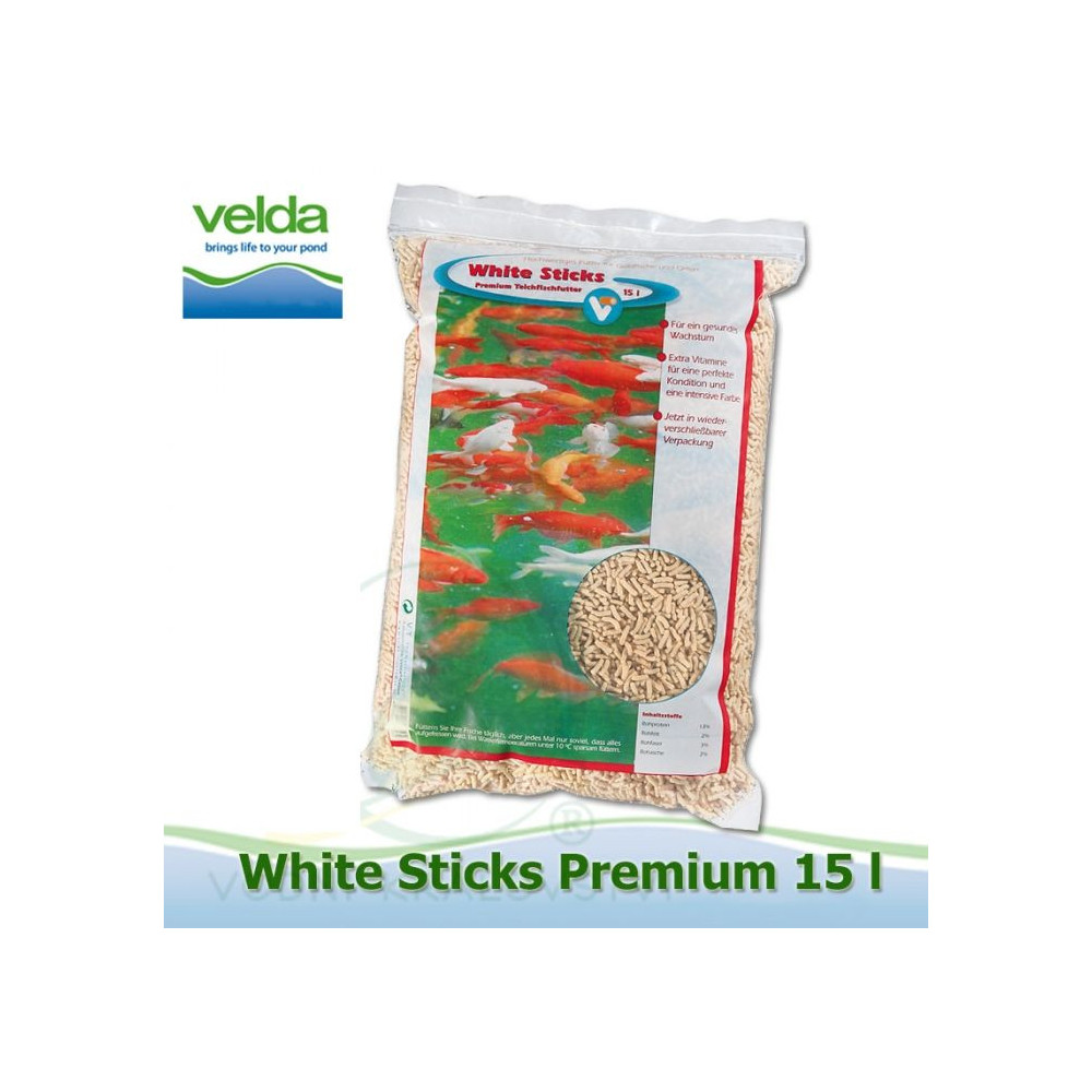 Velda prémiové vynikající rybí krmivo White Sticks Premium 15 litrů pro všechny druhy ryb. Obsahuje správné bílkoviny, tuky a minerály, které ryby potřebují pro zdravý růst. Pro optimální kondici a vybarvení ryb jsou přidány další vitamíny. V užitečném vaku o objemu 15 l.