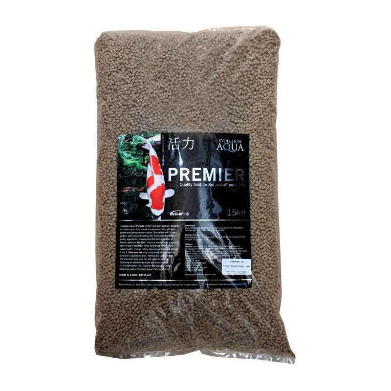 Vysoce kvalitní krmivo Evolution Aqua Premier 15kg 5-6 mmpro střední a velké ryby a speciálně pro Koi kapry, KOI a všechny jezírkové ryby.