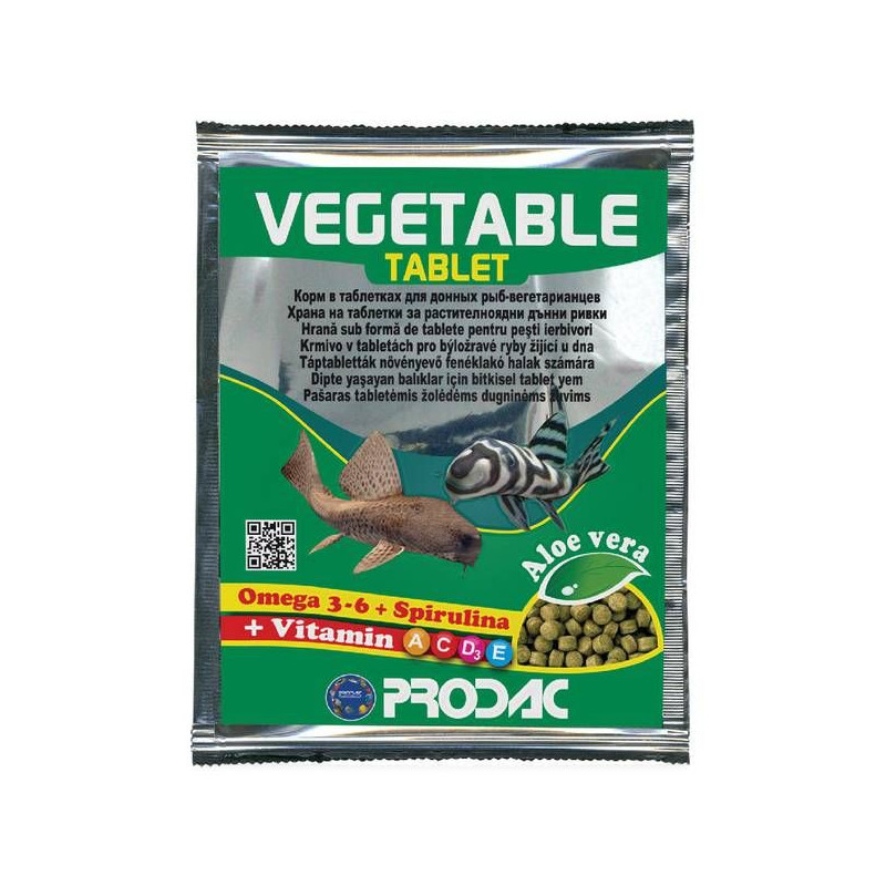 Krmivo pro akvarijní ryby Prodac Vegetable 12g, tablety. Vyvážená protrava se spirulinou,obohacená o vitamíny a mastné kyseliny. Kompletní krmivo ve formě tablet určené pro býložravé ryby přijímající potravu ze dna.