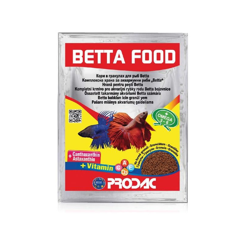 Kompletní rybí krmivo Prodac Betta Food 12 g pro Betty Bojovnice pestré. Granule pro ryby Prodac Betta Food s obsahem omega 3 a 6 nenasycených mastných kyselin.