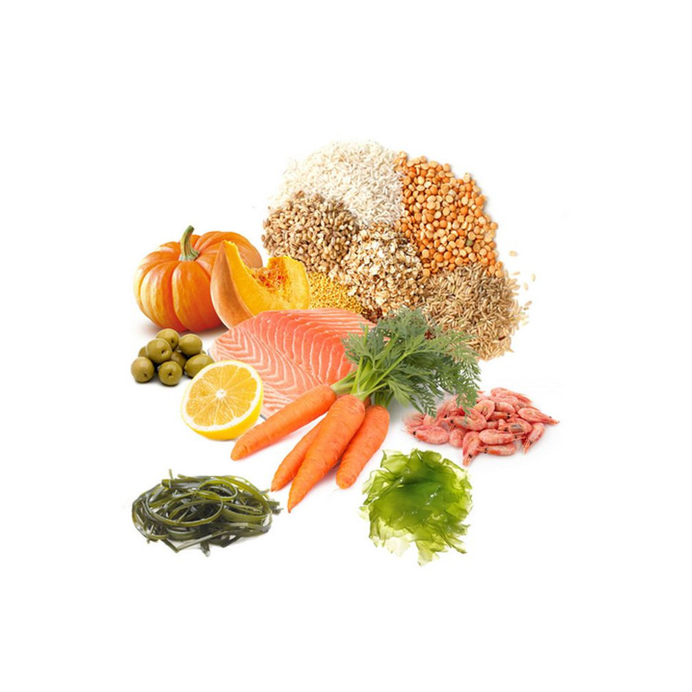 sója, ryby a rybí produkty, obiloviny, korýši, zelenina, řasy, obohaceno o vit. A, C, D3, E a Omega 3 a 6 mastné kyseliny