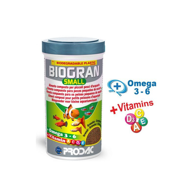 Prodac Biogran Small 100ml jsou granule pro ryby vhodné jako krmivo pro sladkovodní i mořské druhy ryb menších velikostí, zvláště pro malé druhy cichlid. Prodac Biogran Small je kvalitní krmení pro ryby, které má vysokou stravitelnost a nekalí vodu.