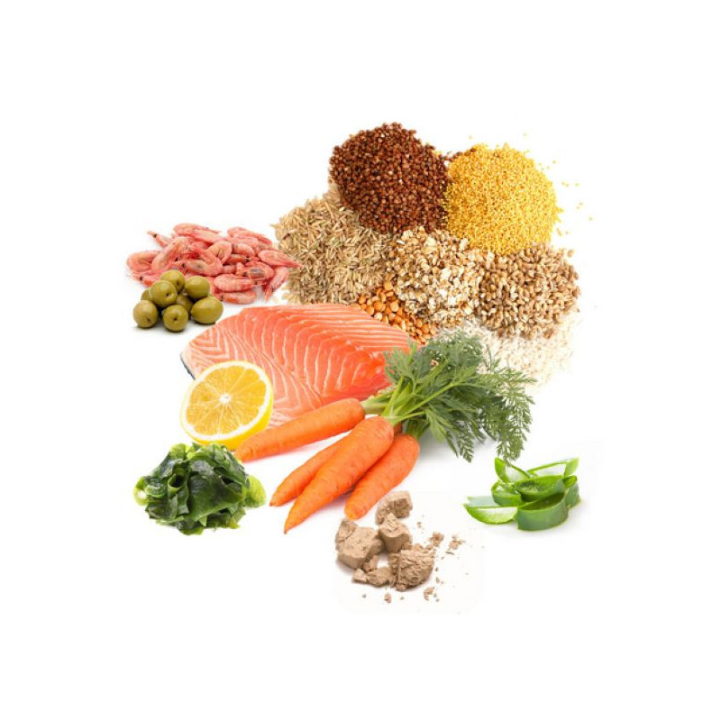 obiloviny, ryby a ryby podle produktů, soja, kvasinky, korýši, řasy, aloe vera 0,05%.