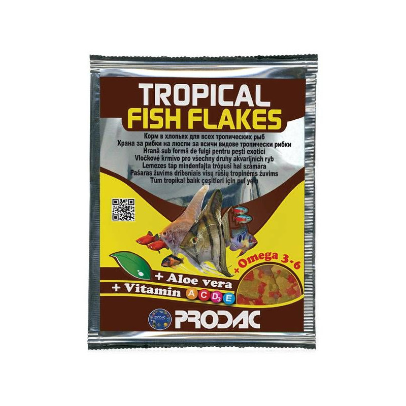 Vločkové krmivo Prodac Tropical Fish Flakes pro akvarijní ryby z tropických oblastí. Mix rozmanitých vysoce kvalitních surovin jako je rybí moučka, moučka z krevet, rýžová a pšeničná mouka či kvasnice tvoří kompletní krmivo podporující zdraví Vašich rybek. Díky dokonalému zpracování krmivo nekalí vodu v akváriu