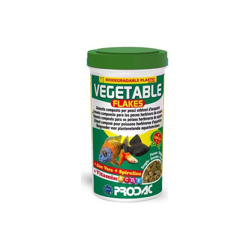 Prodac Vegetable Flakes 100 ml je akvarijní krmivo pro býložravé akvarijní ryby. Kompletní krmivo pro okrasné akvarijní rybky, zvláště pro ryby preferující rostlinnou stravu.Vysoký obsah rostlinných mouček, zeleniny a mořských řas plně uspokojí potravní nároky byložravých ryb.