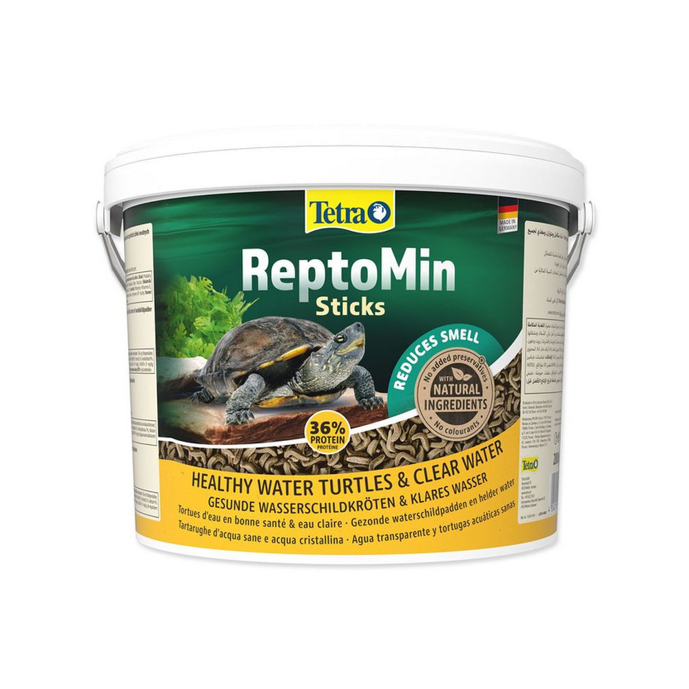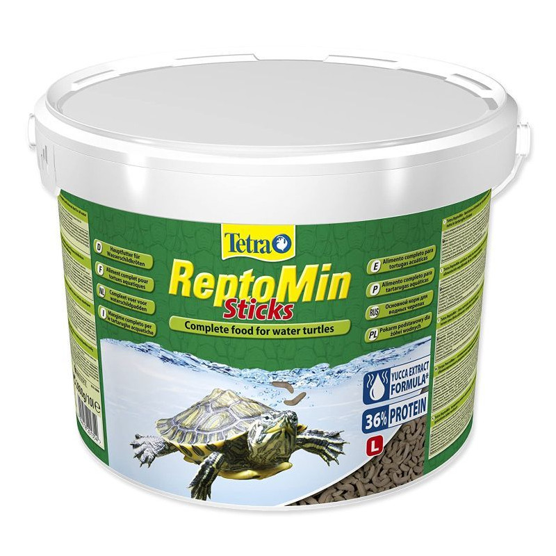 Pelety pro vodní želvy Tetra ReptoMin 10l jsou prémiové kvality, nutričně vyvážené a vhodné pro každodenní krmení. {reptomin_sticks} Tetra Repto Min Sticks 10l želvám velice chutnají. Plovoucí pelety jsou lehce stravitelné. Díky optimálnímu poměru vápníku a fosforu krmivo podporuje dobrý stav krunýře a silné kosti. Druhově odpovídající potrava ve tvaru tyček speciálního červovitého tvaru velmi vyhovuje. Snižuje nepříjemný zápach v akváriu díky extraktu z juky. Čistá voda díky lehké stravitelnosti.