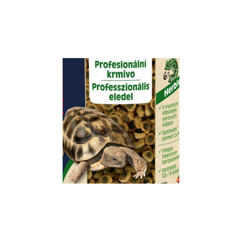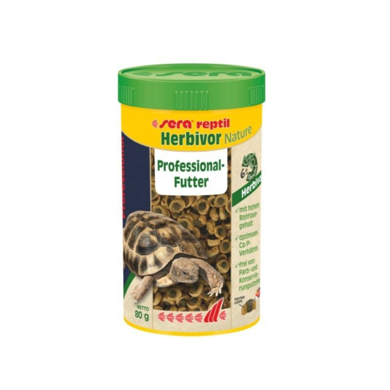 Značkové krmivo SERA Reptil Professional Herbivor Nature 1lse hodí ke krmení býložravých želv, leguánů a plazů. Doplňkové krmivo v podobě dvoubarevných plovoucích granulí vyniká kvalitou a obsahem vlákniny, bílkovin a tuků. Vnější obal granule krmiva ze směsi odpovídající přirozeným nutričním potřebám plazů. Jádro krmení je extrudováno při nižší teplotě a tudíž velmi šetrně. Obsahuje velký objem vitamínů, minerálů a řas pro posílení imunity reptilií. Optimální poměr vápníku a fosforu je podporuje zdravý růst kostí a krunýře.