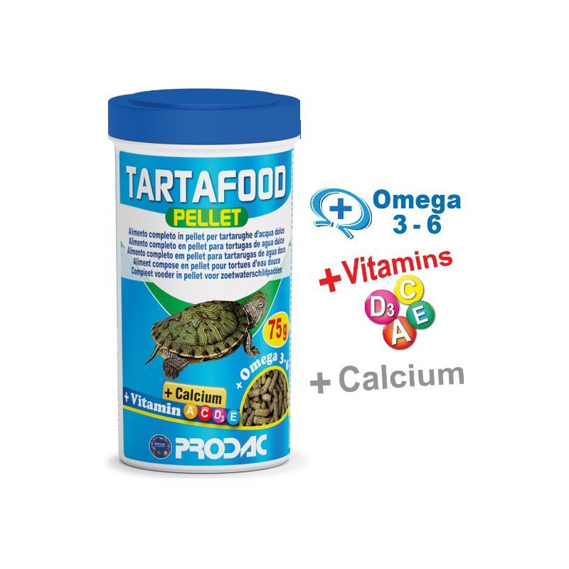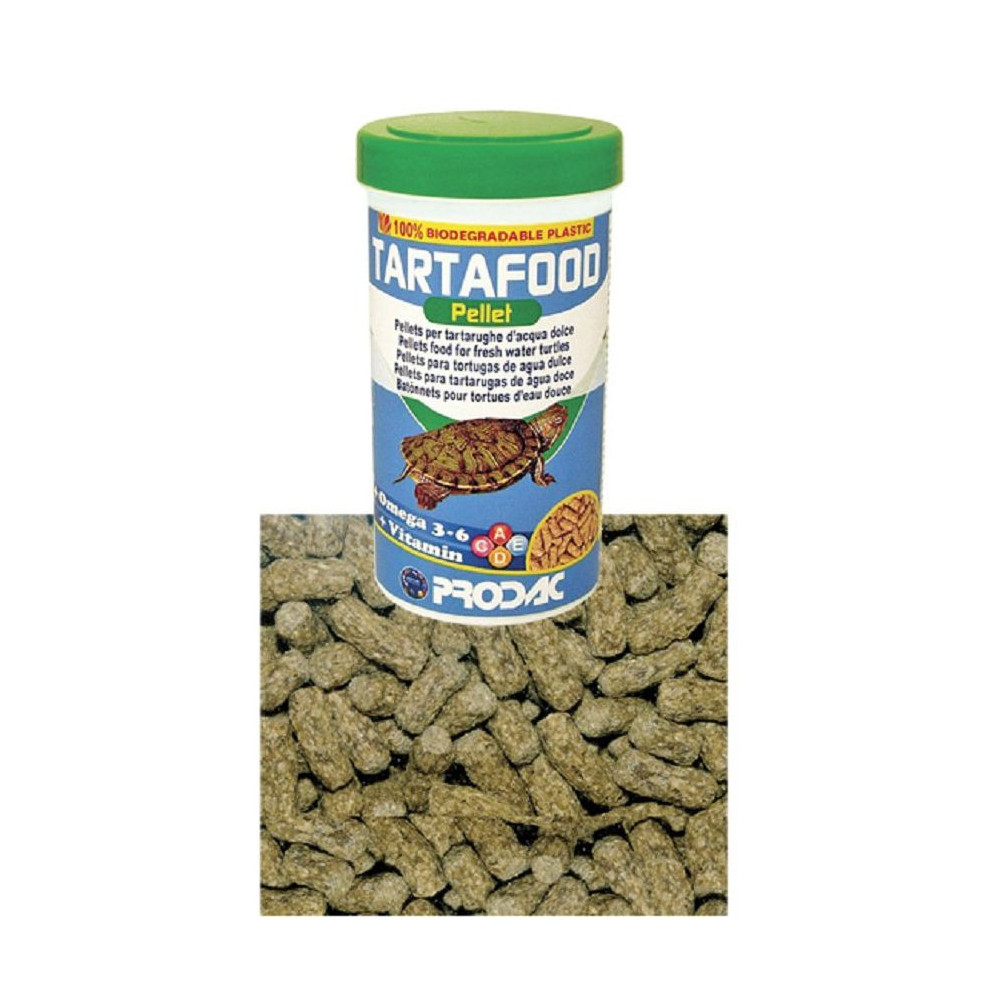 Prodac Tartafood peletky, pellet 75g, 250ml, uspokojí krmné nároky vodních želv. Krmivo je obohacené o Omega 3-6 a řadu vitamínů.