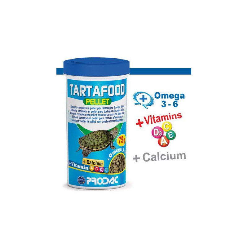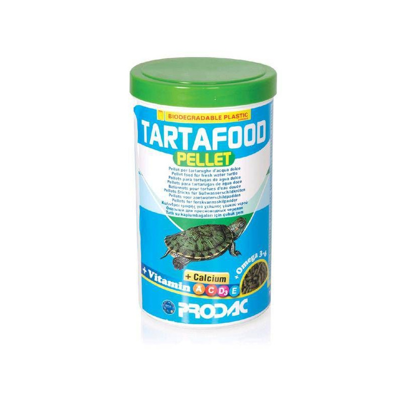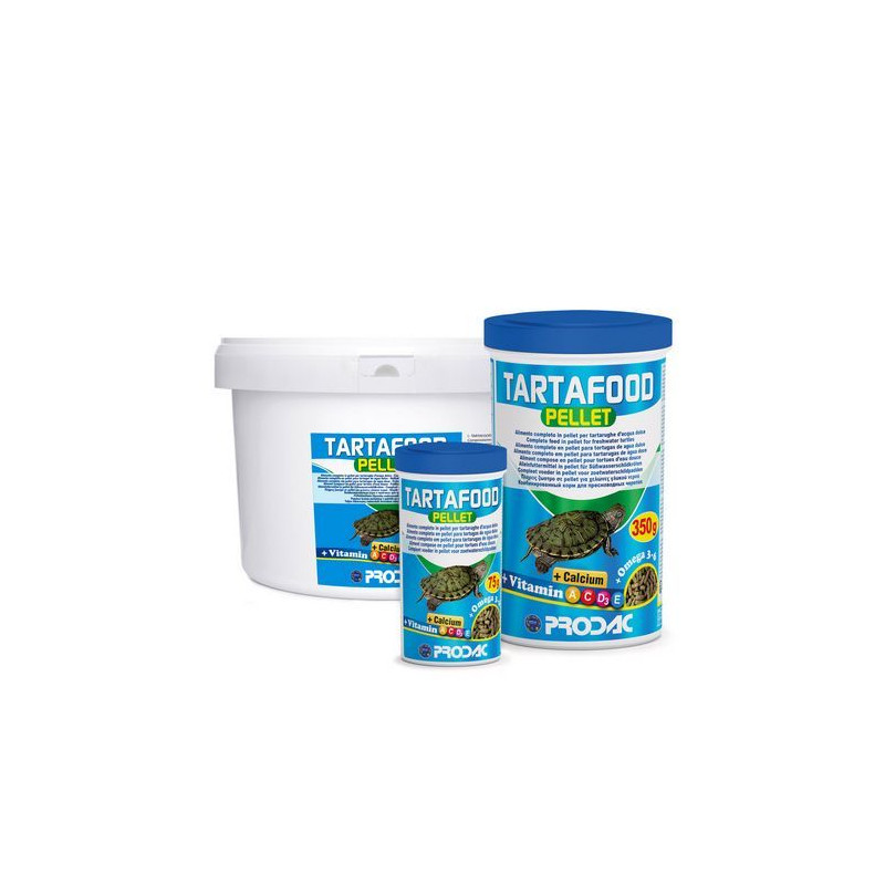 Prodac Tartafood peletky, 350g je plovoucí kompletní krmivo cca 1,2l pro každodenní stravu velkých vodních želv a také obojživelníků.