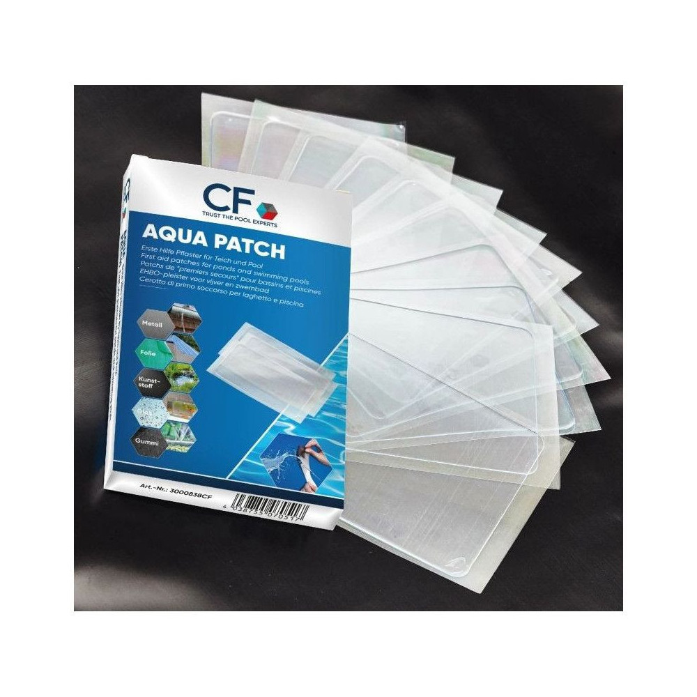 Opravná samolepící záplata z průhledné pásky AQUA PATCH 10 ks. Extrémně silná a vodotěsná opravná páska AQUA PATCH je skvělá efektivní opravy folií v jezírku a bazénu. Zvládne však řadu různých materiálů. Tato opravná páska je navržena tak, aby byla snadno použitelná a spolehlivá, což ji činí ideální volbou pro různé situace, kde je potřeba opravit netěsnosti nebo poškození. Díky své univerzálnosti a jednoduchosti použití je tato páska skvělým pomocníkem pro každodenní použití.
