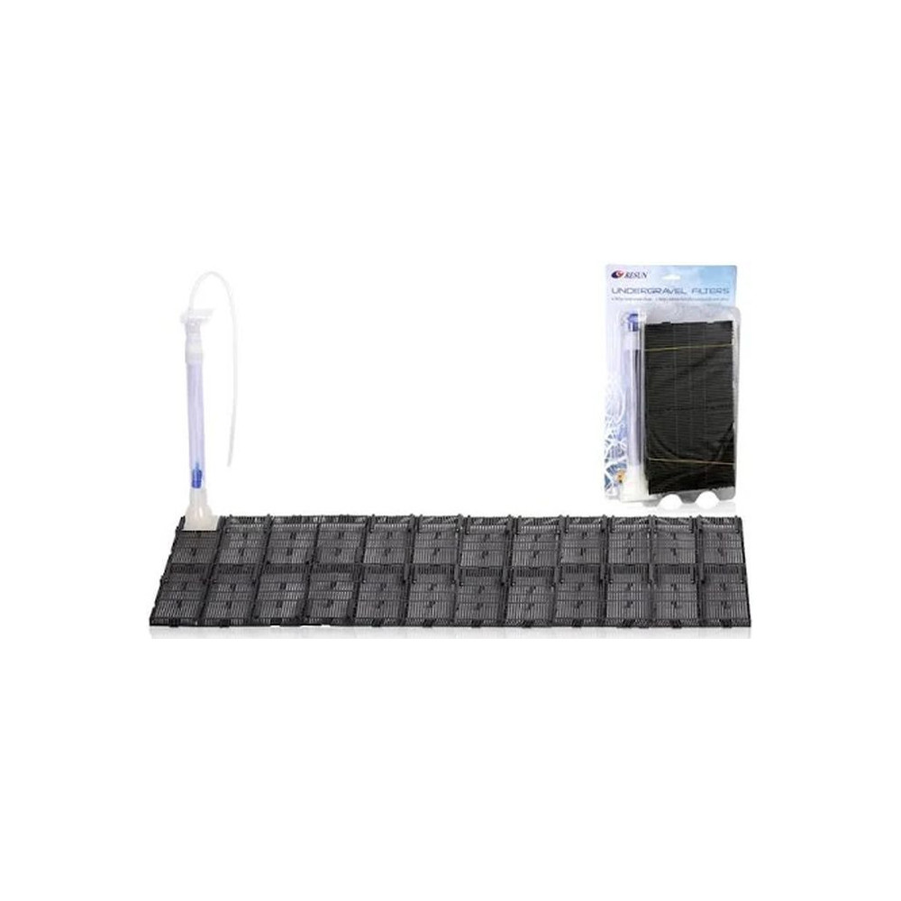 Resun podpískový filtr do akvária RS-24P 85cm x 30cm se připojuje na akvarijní čerpadlo, na vhodný typ čerpací hlavy nebo vzduchovací kompresor. Akvarijní půdní filtr RS-24P jako filtrační médium využívá substrát dna akvária. Půdní filtr RS-24P (pohon zajišťuje vzduchový kompresor, který je potřeba dokoupit) saje vodu z nádrže plochou dna (nebo alespoň jeho částí), voda se průchodem přes vrstvu písku filtruje a trubkou se vrací zpět do akvária.