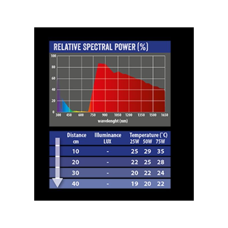 Žárovka REPTI PLANET Night Heat simuluje přírodní měsíční světlo a je ideální v kombinaci s denními výhřevnými žárovkami (např. Repti Planet Infrared Heat, Daylight Basking Spot, Daylight Frosted, Daylight Neodymium nebo Far Infrared Heat). Intenzita tepelného záření je nižší, což je ideální z důvodu přirozeného poklesu nočních teplot v přírodě. Zbarvení je dosaženo prostřednictvím modré barvy skla.
