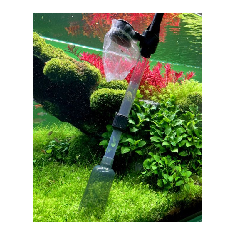 Odkalovač nasává vodu s nečistotami ze dna akvária. Na výtoku je umístěna jemná filtrační síťka, která zachytává nasáté nečistoty. Čistá voda se vrací zpět do akvária bez ztráty objemu vody, což je ideální pro rychlé čištění bez nutnosti dopouštění vody.
