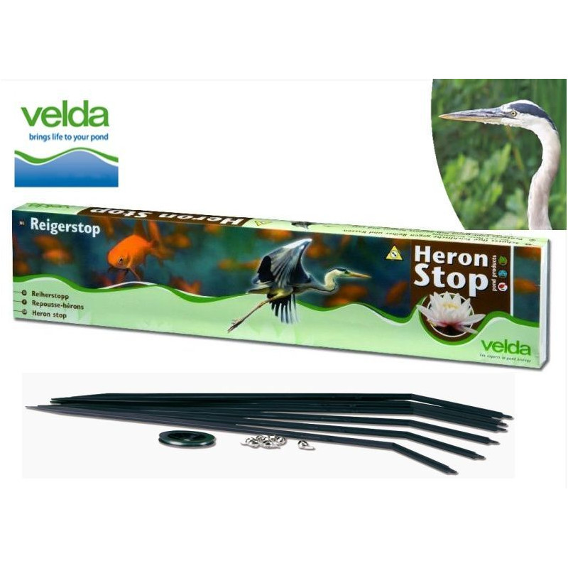 Jednoduchý akustický ohradník Velda – Heron Stop. Cinkající zvuk pohybujících se rolniček spolehlivě zaplaší Volavky a všechny nežádoucí vodní ptáky. Plastové kolíky rozmístěte po obvodu jezírka. Na ně uchyťte tenkou nylonovou šňůrku a zavěste malé rolničky.