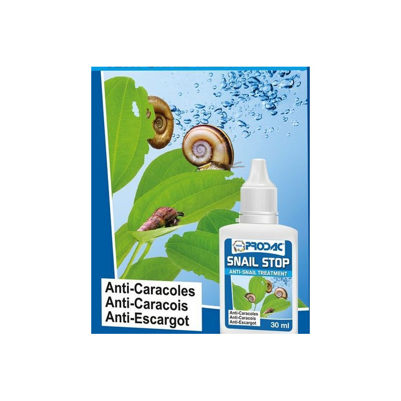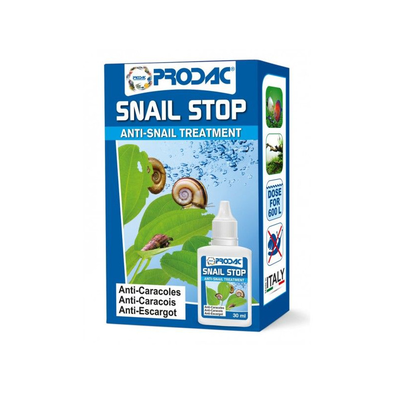 Prodac Snail Stop, 30ml je velmi účinný přípravek v boji proti různým druhům šneků (plžů) a cizopasníků v akváriu do 600l. Hubí vajíčka. Nepůsobí negativně na ryby a rostliny obývající akvárium. Je také bezpečný pro bakteriální flóru nádrže.