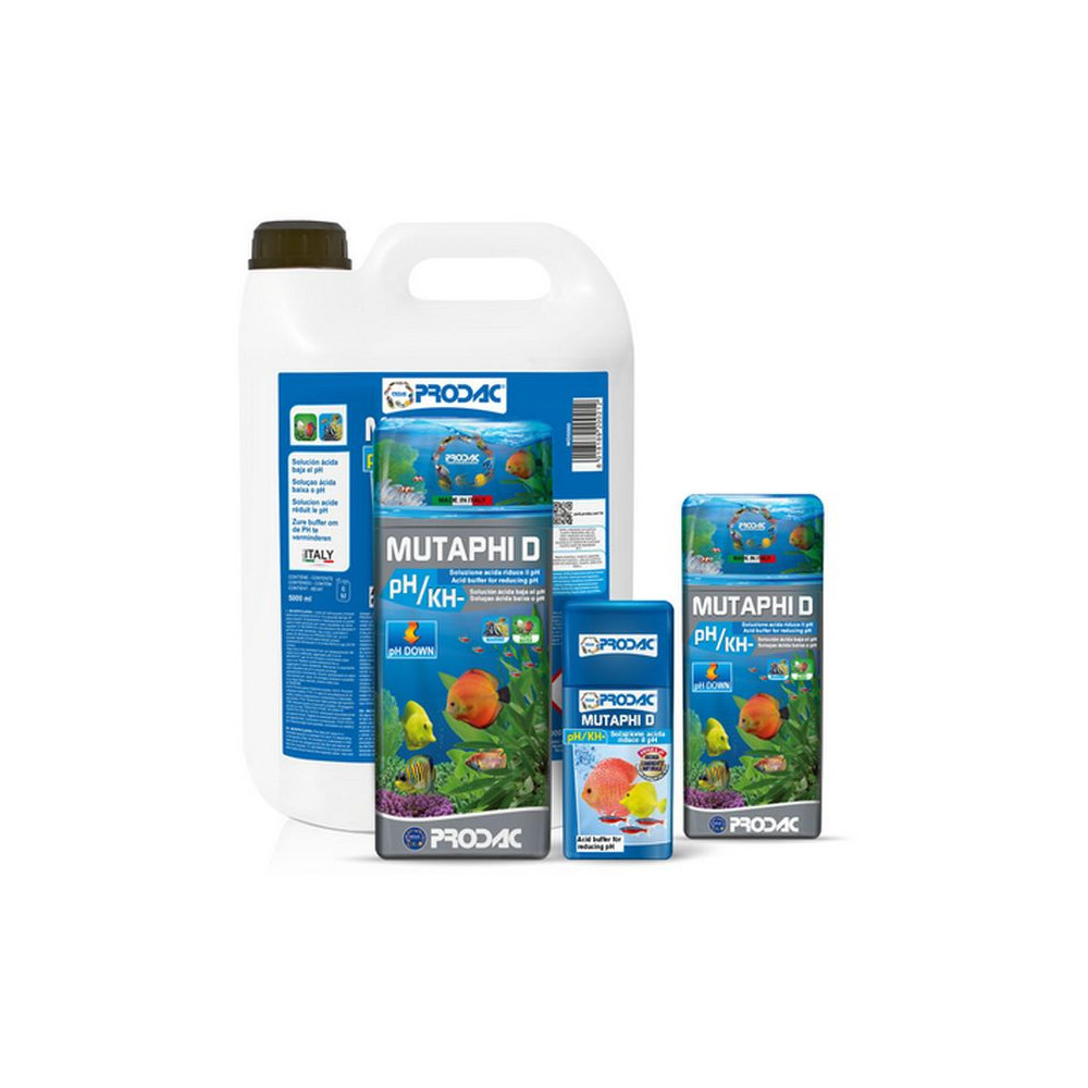 Přípravek Prodac Mutaphi D pH- 100 ml pro snížení pH v skladkovodním akváriu i mořském akváriu. Optimální hladina pH se ve sladkovodním akváriu pohybuje v rozmezí mezi 6,5 až 7 dle druhů ryb. Jakékoliv snížení či zvýšení těchto pH může být pro ryby velmi nebezpečné a to především při přesažení hodnoty 7,5.