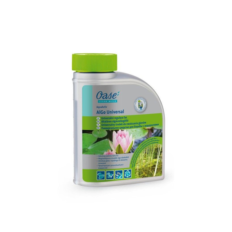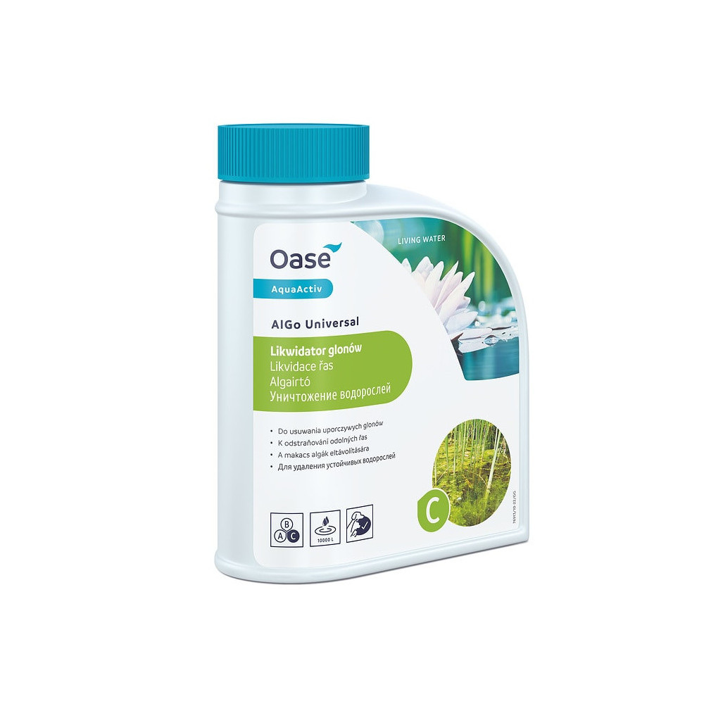 OASE AlGo Universal 500 ml je přípravek na vláknité (dlouhé) řasy v jezírku, který je vhodný pro okrasné rybníčky, koupací jezírka i jezírka s chovem ryb na 10000 litrů vody. Německý přípravek na růst růst řas efektivně působí proti růstu dlouhých vláknitých řas. Přípravek na vláknité řasy na ty běžně rozšířené. Přípravek proti řásám ALGo Universal efektivně působí proti nejčastějším typům řas jako jsou bahnité řasy a vláknité řasy, a to bez toho, aby ekosystém jezírka utrpěl nějaká poškození.