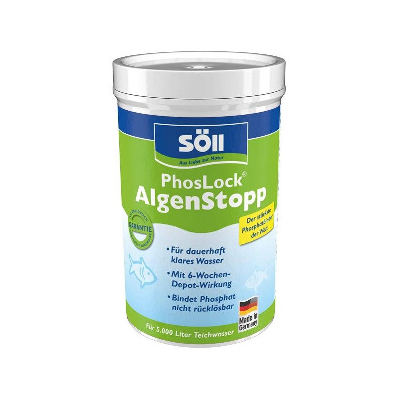 Odstraňovač řas v jezírku Söll PhosLock AlgenStop 5 m3 zamezuje růstu vláknité řasy v jezírku. Slouží jako optimální prevence proti růstu řas. Přípravek P-Lock AlgaeStop 250g přemění fosfát na nerozpustný apatit.