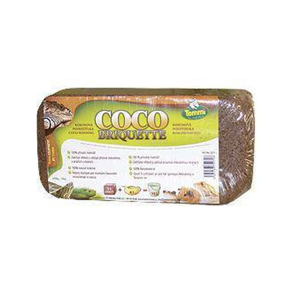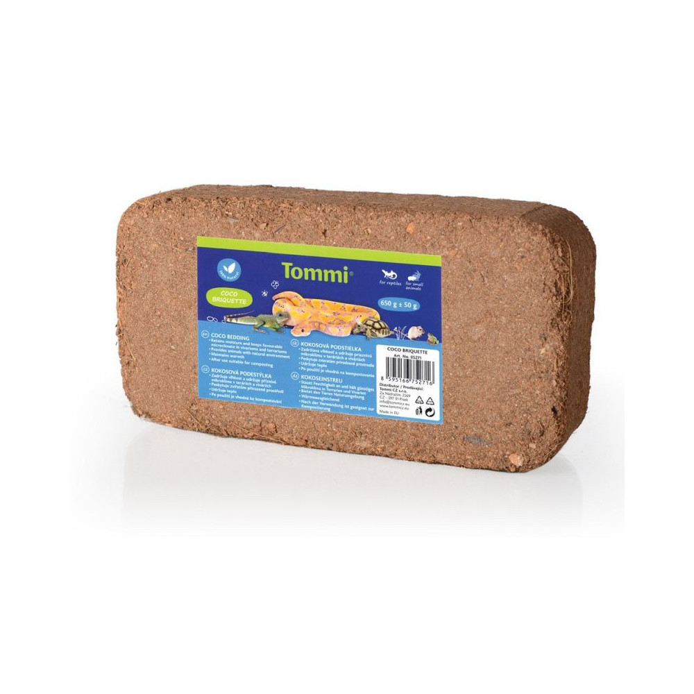 Tommi Coco Briquettes je přírodní stelivo. Slouží jako snadno použitelná terarijní podestýlka. Neobsahuje žádná umělá hnojiva. Výrobek byl před kompresí sterilizován.