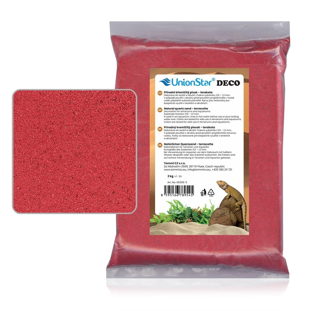 Jemný písek do terária v teplém oranžovo-červeném odstínu DECO Terakota 2 kg slouží jako substrát a umožňuje vytvořit přirozené i pohodlné prostředí pro plazy, obojživelníky