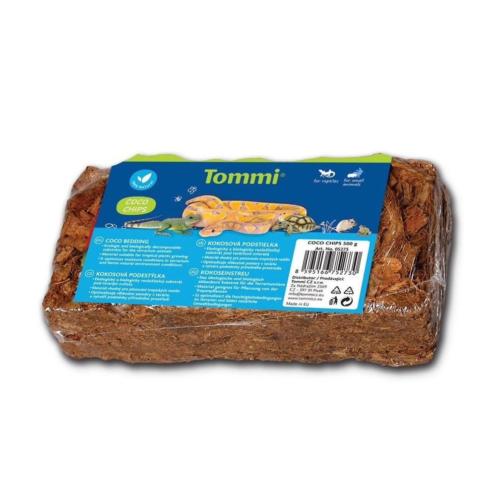 Tommi slisovaný terarijní substrát Coco Chips 500g stačí namočit, počkat na nabotnání, použít.