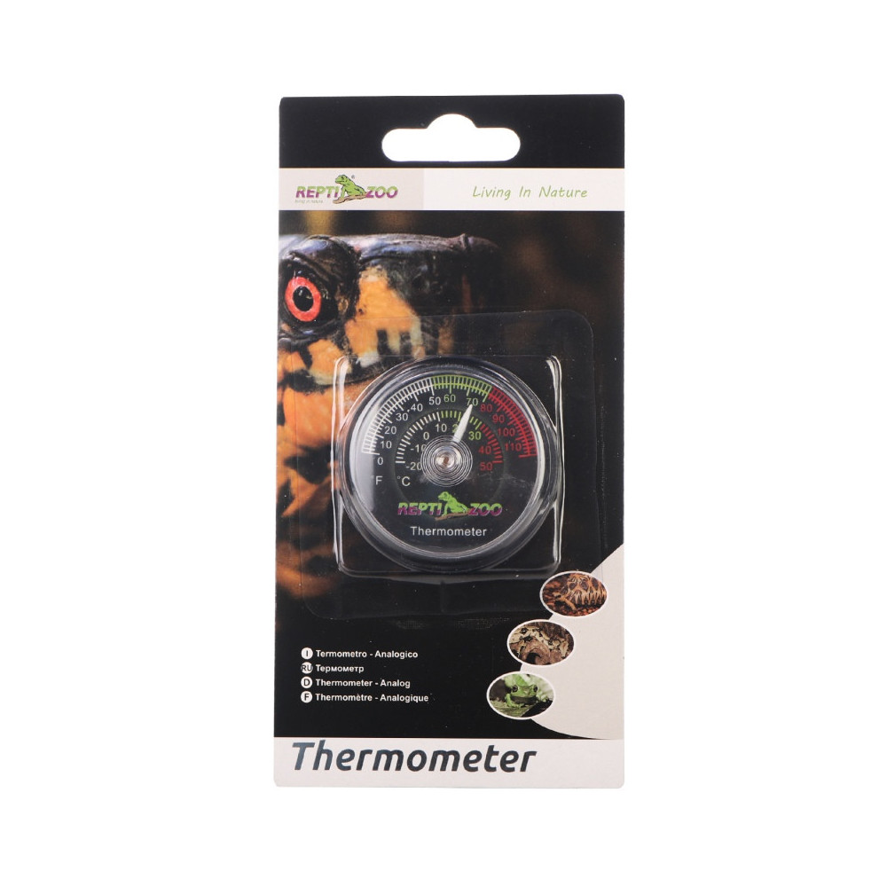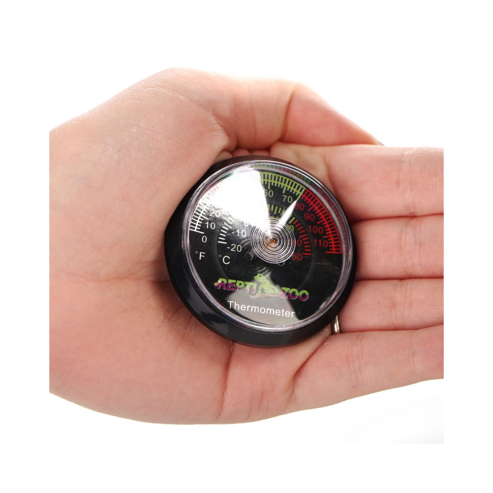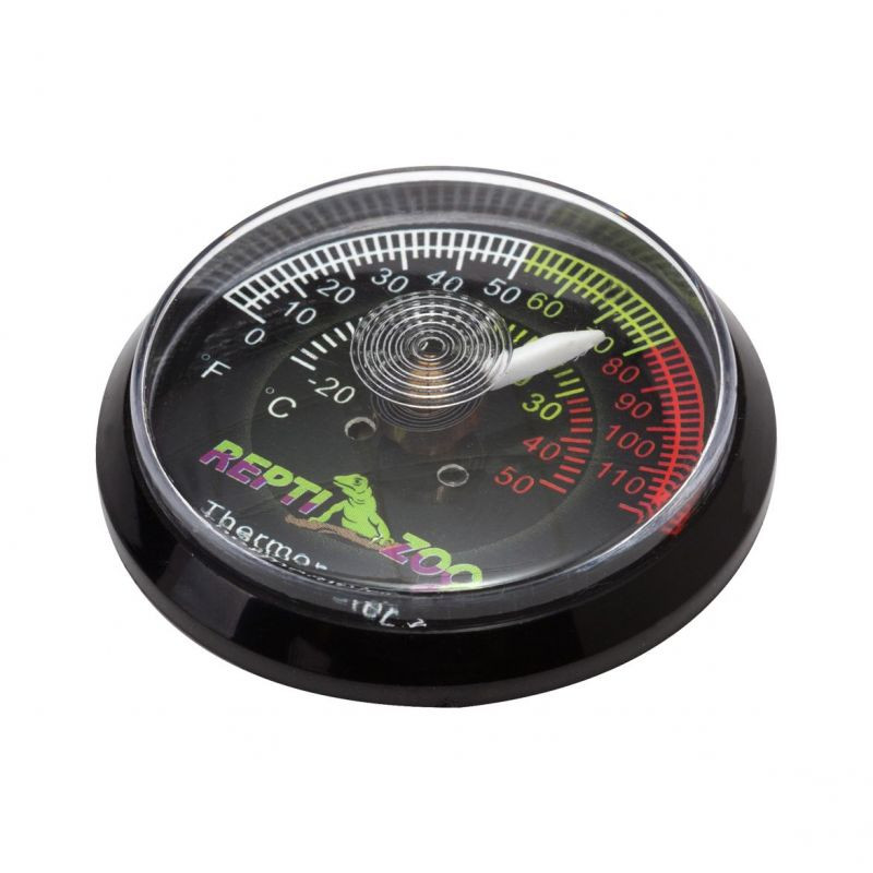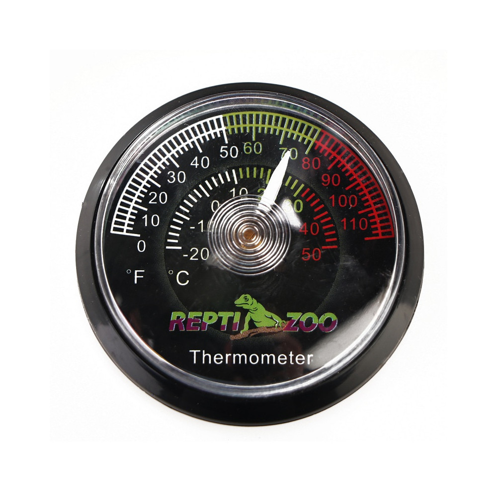 Analogový terarijní teploměr ReptiZoo RT01 s kovovým čipem určený k měření teploty v teráriích. Teploměr je na zadní straně opatřen odolnou samolepící páskou pro snadné uchycení na bok terária.