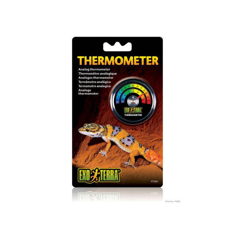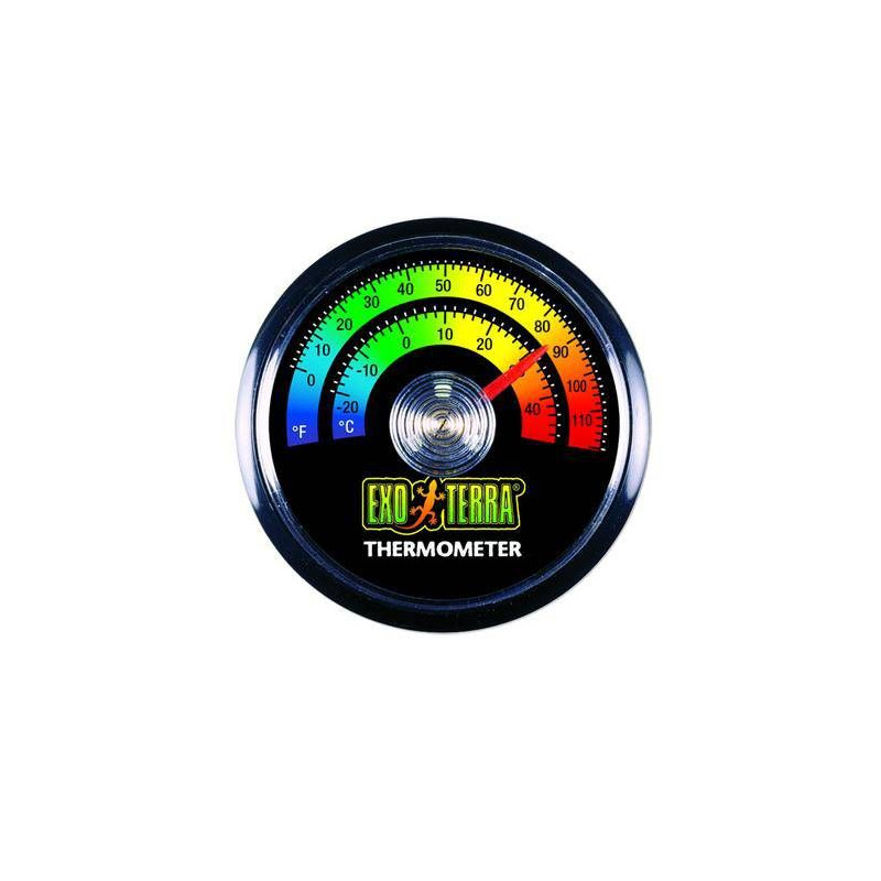 Samolepící terarijní teploměr Rept-O-Meter Exo Terra. Jednoduché připevnění na hladký povrch. Teploměr nedávejte na nechladnější ani na nejteplejší místo terária. Pomocí teploměru můžete kontrolovat teplotu v teráriu. Pro zajištění teplejšího místa v teráriu můžete použít topné kameny nebo topné kabely do zásuvky. Pro celkové temperování jsou vhodná osvětlovací tělesa osazená keramickými zářiči nebo žárovkami, které svítí a současně zvyšují okolní teplotu.