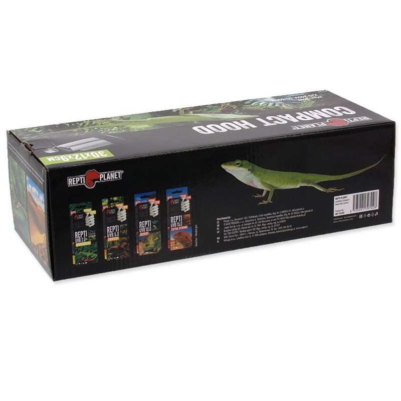 Terarijní osvětlení REPTI PLANET Compact Hood 30 cm. Kvalitně zpracované osvětlení REPTI PLANET Compact Hood 30 pro terarijní žárovky. Konstrukce umožňuje horizontální použití žárovek, což je ideální varianta pro UVB žárovky, které touto instalací nabízejí vyšší výkon UVB záření. Pro výhřevné žárovky je tento systém nevhodný, neboť se v drtivé většině jedná o žárovky s reflektorovým systémem a žárovka by tedy ohřívala pouze vnitřní část světla a směrem dolů by neměla téměř žádnou účinnost.