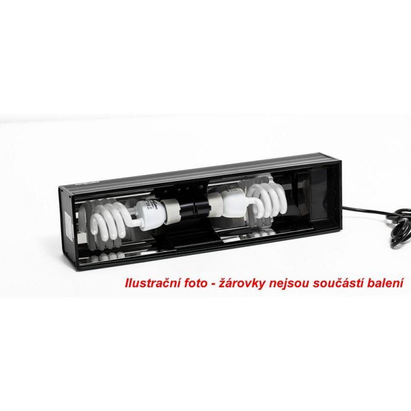 Osvětlení terária ReptiZoo Compact 45,8cm v hliníkovém provedení je potažené vrstvou plastu zajišťující ochranu. Jako Repti Planet Compact Hood 46 {teraristika-30} je terarijní kryt Repti Zoo na dvě úsporné UVB žárovky se závitem E27 a příkonem 26W. Osvětlovací těleso je vybaveno vypínačem pro snadné zapnutí a vypnutí kompaktních žárovek. Vedle spínače se nalézá přívodní kabel. Kryt není možné použít s keramickými výhřevnými žárovkami nebo jinými s vyšším příkonem.