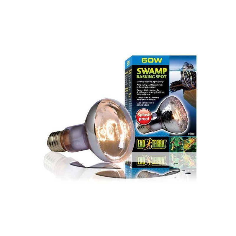 Žárovka Exo Terra Swamp Basking Spot 50W snáší vodu a vlhkost, což ji činí ideální pro vlhké prostředí nebo pro terária s vyšší vlhkostí, například pro želvy či obojživelníky