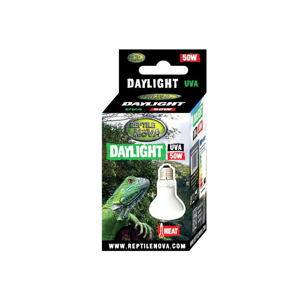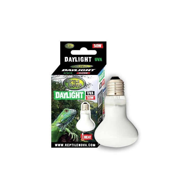 Aqua Nova UVA DayLight 50W terarijní žárovka Reptile Nova UVA Solar Basking Floodlight 50W vydává denní výhřevné světlo stejně jako Exo Terra Dayligh Basking Spot nebo Repti Planet.