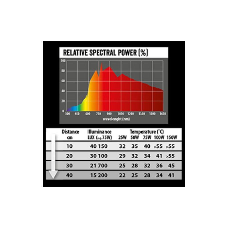 Výkonná 75W sluneční žárovka vytváří ideální výhřevné místo v teráriu. Obsahuje UVA složku pro podporu fyziologických procesů, chuti k jídlu a aktivity plazů.