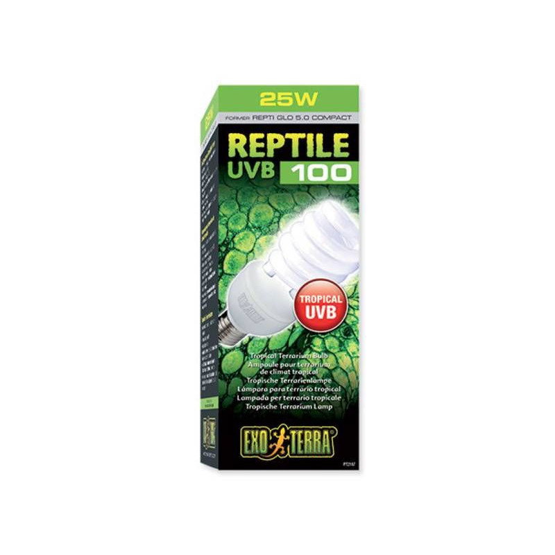 Terarijní žárovka Reptile UVB 100 25W je UVB žárovka pro tropická a subtropická terária. Exo Terra Reptile UVB 100 je vhodná pro všechny tropické a subtropické plazy. Kompaktní žárovka produkuje vysoký výkon ultrafialového záření UVB s účinností až do 30 cm (12”) od umístění v tropickém a subtropickém teráriu. Poskytuje potřebné ultrafialové paprsky UVB pro optimální metabolismus vápníku.