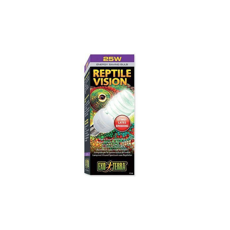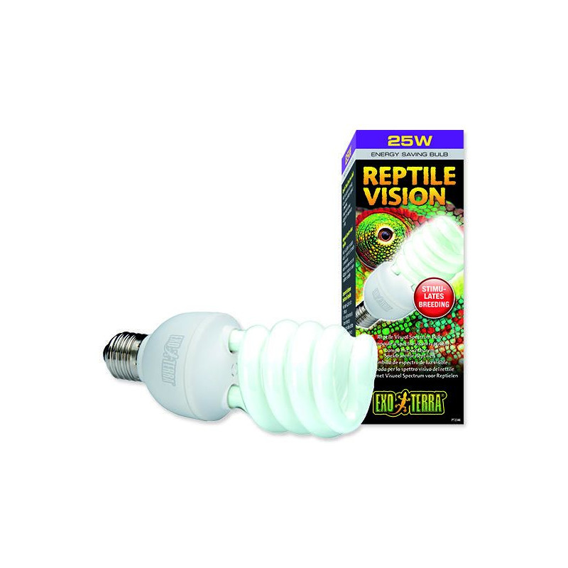 Terarijní žárovka Exo Terra Reptile Vision 25 W s vlnovými délkami, které vnímají oči plazů. Žárovka nabízí ideální spektrum viditelného světla, ideálního pro všechny druhy plazů a obojživelníků. Podporuje chuť k jídlu a chov a zlepšuje u zvířete vnímání svého prostředí. Zlepšuje přirozené chování a je přizpůsobena pro 4 receptory v očich plazů. Tyto žárovky však nestačí na vytápění terária.