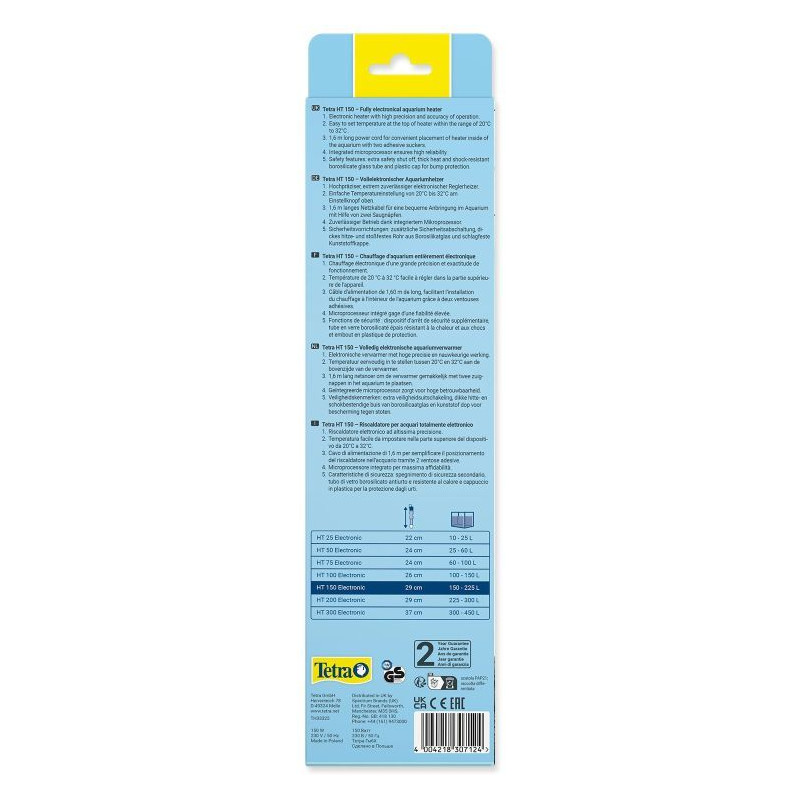Topítko Tetra Electronic HT 150 je speciální ohřívač určený pro akvária o objemu 150 až 225 litrů. Jeho úkolem je udržovat stálou teplotu vody, která je pro vaše rybičky nezbytná. Díky nastavitelnému termostatu si můžete přesně určit, jak teplou vodu chtějí vaše vodní miláčky mít.