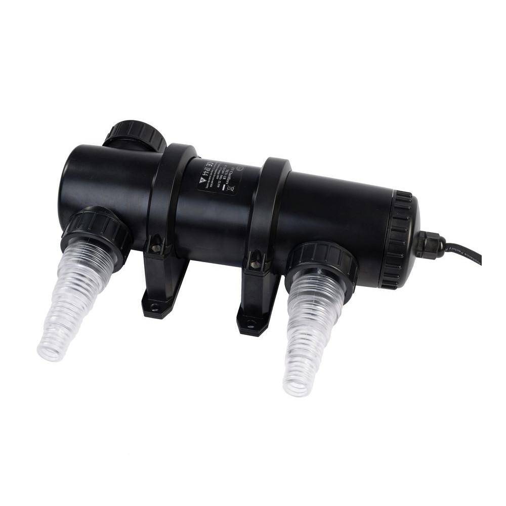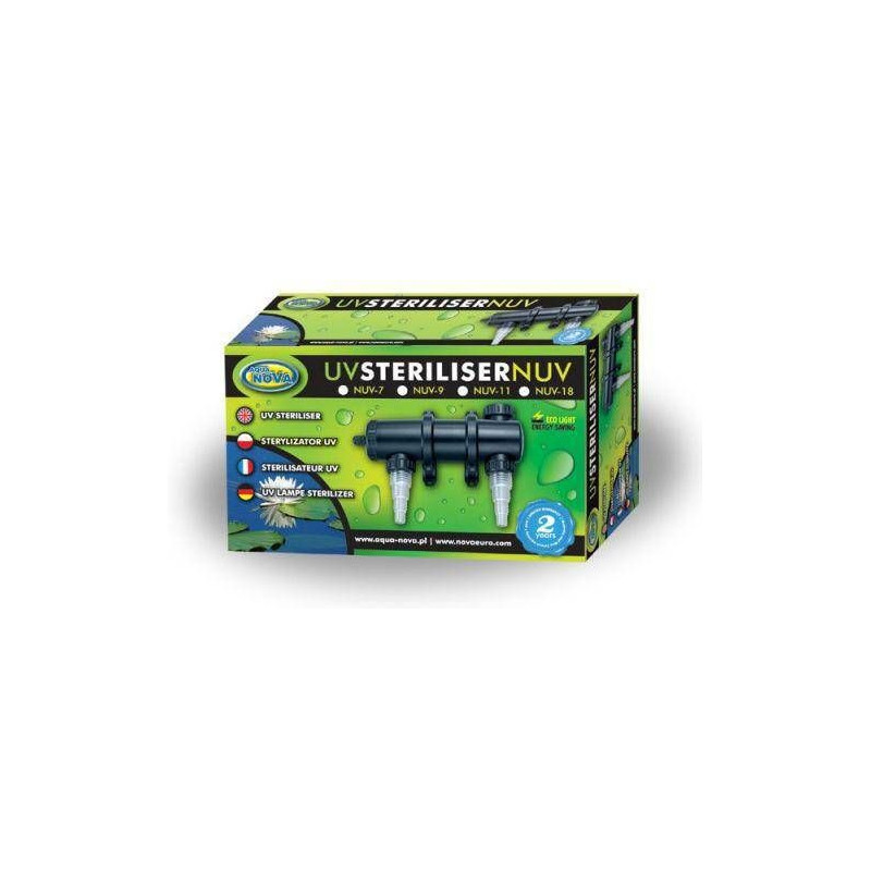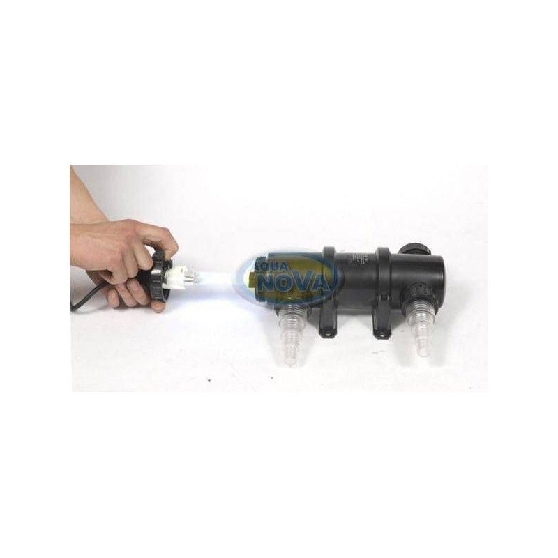 UV lampa Aqua Nova NUV-11, 11W, se zářivkou je sterilizátor vody pro zahradní jezírko nebo akvárium. UV-C lampa je zařízení, které je vhodné pro snížení růstu řas (zákal vody) a mikroorganismů bez použití chemie, vhodná na zahradní okrasná jezírka, akvária a další vodní nádrže. Pokud tedy máte málo průhlednou zelenou vodu, tak je vhodné použít pro vyřešení problému UVC lampu. Připojení a obsluha jsou velice jednoduché. Voda z nádrže protéká zařízením a při tom jsou hubeny viry, bakterie, řasy, a další choroboplodné zárodky. UV lampu ednoduše můžete integrovat do vašeho stávajícího oběhu vody, neboť je vybavena hadicovými adaptéry. Použitím UV lampy pomůžete k biologické rovnováze ve vašem akváriu a rybníčku. Jezírkové UVC lampy AQUA NOVA se snadno připojují před jezírkové filtry pomocí hadicových adaptérů. Co je vstup a výstup se nerozlišuje.