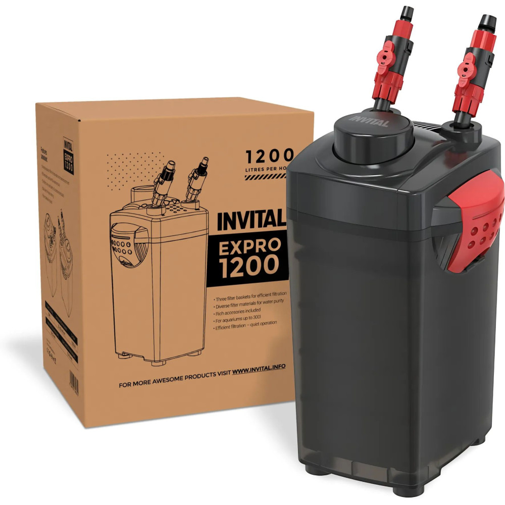 Vnější filtrace Invital EXPRO-1200 pro akvárium do 300 litrů. Filtr Invital 1200 l/h vybavený filtračními materiály v košíkách. Ideální pro udržování perfektní kvality vody ve vašem akváriu.